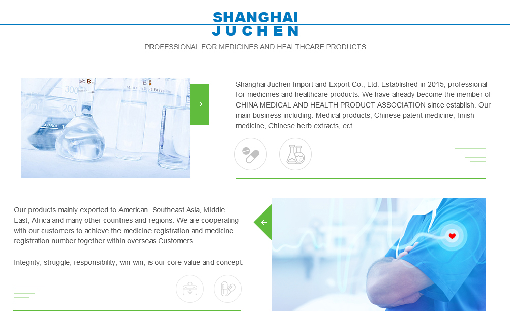 Shanghai Juchen Import and Export Co., Ltd. Established in 2015, professional for medicines and healthcare products. We have already become the member of CHINA MEDICAL AND HEALTH PRODUCT ASSOCIATION since establish. Our main business including: Medical products, Chinese patent medicine, finish medicine, Chinese herb extracts, ect. Our products mainly exported to American, Southeast Asia, Middle East, Africa and many other countries and regions. We are cooperating with our customers to achieve the medicine registration and medicine registration number to...More>